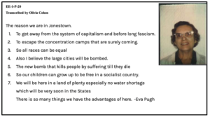 Students are asked to include a photo of the author at the end of their transcribed letters, often sourced from the Jonestown Memorial List. Our task is to represent the words and worlds of fellow humans, many of whom labored to build a society free from racism, classism, and colonialism – and most of whom lost their lives on November 18, 1978. Including a photo at the end of the letter serves to reinforce to the transcriber that the words in front of them were penned by a real person who lived a complex life of emotions, disappointments, frustrations, joys, and dreams, just as they do. Even in a class that privileges a human-centered lens of study, it can be easy to forget this human dimension.