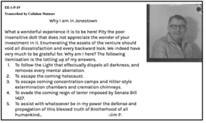 Our primary focus has been transcribing letters containing accounts and confessions about life at Jonestown. The letters provide unique insight into the varied racial and gendered experiences of Jonestown residents that cannot otherwise be accessed. Some of the letters reveal the mundane realities of life in Jonestown; others, the range of human emotions— resentments, jealousies, and attractions— that inevitably percolate in an intimate communal setting. Many letters provide a close look at the forms of knowledge and radical politics that were privileged in Peoples Temple. Others give insight into the dynamics of authority that Rev. Jones wielded. And several make clear the authors’ willingness to die for their community and the cause of socialism.