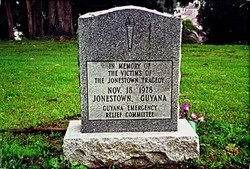 About 414 people – mainly children – who died in the Jonestown tragedy of 1978 are buried in a large hillside gravesite at the Evergreen Cemetery in Oakland, California, a site which is marked by a headstone and four granite plaques, listing the names of everyone who died.